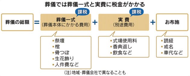葬儀についても見てみよう。これも3つの費用に分類される。ひとつは、祭壇や棺(ひつぎ)、骨つぼや生花飾りといった葬儀本体にかかる「葬儀一式」、ふたつ目が式場の使用料や飲食、香典返しなどの「実費」、そして最後に読経や戒名などに対して寺院や僧侶に渡す「お布施」となっている。このうち、お布施には税金がかからない。それ以外の葬儀一式と実費には消費税がかかる。飲食の費用に関しては、弁当を購入して会場に持ち込んだ場合は軽減税率が適用されそうだが……。お布施以外の2つは通常は葬儀会社にまとめて支払い、そこから個別の事業者に渡るケースが多い。「10月以降は、仕出し料理や弁当などを扱う店や、祭壇などを飾る生花店といった仕入れ先の状況によっては、値上げする可能性もある」と葬儀の動向に詳しい鎌倉新書の小林憲行さんは指摘する。
