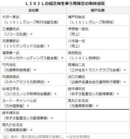具体的にみてみましょう。まず会社側です。LIXILグループ執行役副社長の大坪一彦氏やリコー元社長の三浦氏など10人います。大坪氏以外の9人が社外です。ただ瀬戸氏側が提案している2人が含まれるため、実質的な「会社案」は8人です。